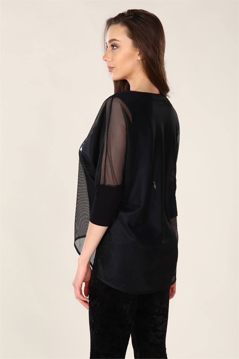 Стильная, лёгкая и приятная на ощупь туника состоит из двух частей: верхней - из сетки с рукавом летучая мышь длиной 3/4 и нижней - из вискозы с фольгированным принтом, соединяющихся между собой по горловине. Она является одной из наиболее популярных моделей, которая отличается высокой стойкостью к износу, воздухопроницаемостью, гигроскопичностью и обеспечивает максимальный комфорт в жаркую погоду.