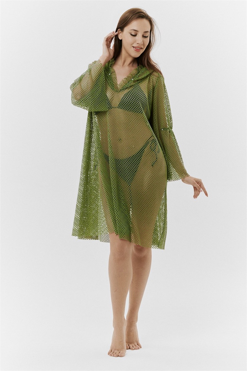 Туника женская пляжная, свободного силуэта с капюшоном и длинным рукавом. Декорирована хольнитенами.