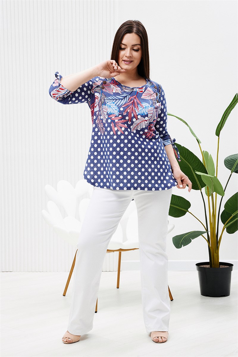Туника женская свободного силуэта. На полочке застроченные вертикальные складки, декорированные пуговицами. Рукав ¾ с завязками.