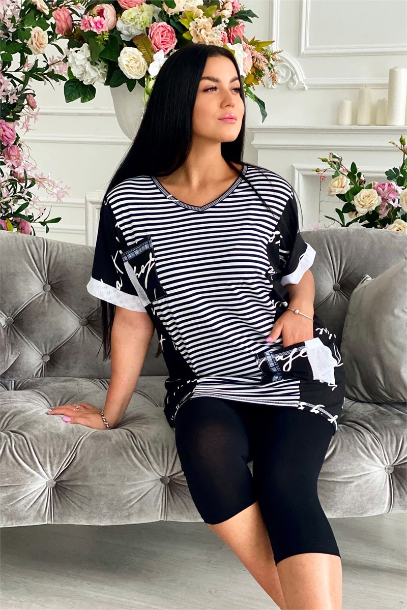Туника женская прямого силуэта. Центральная часть полочки из ткани в мелкую полоску. Вырез Y-образный, рукав цельнокроенный, короткий. На полочке два накладных кармана: нагрудный и боковой. Каждый карман состоит из двух частей: основной и белой сетки, манжета рукава также из сетки. Тесьма на карманах задает тунике особый стиль, популярный в этом сезоне.