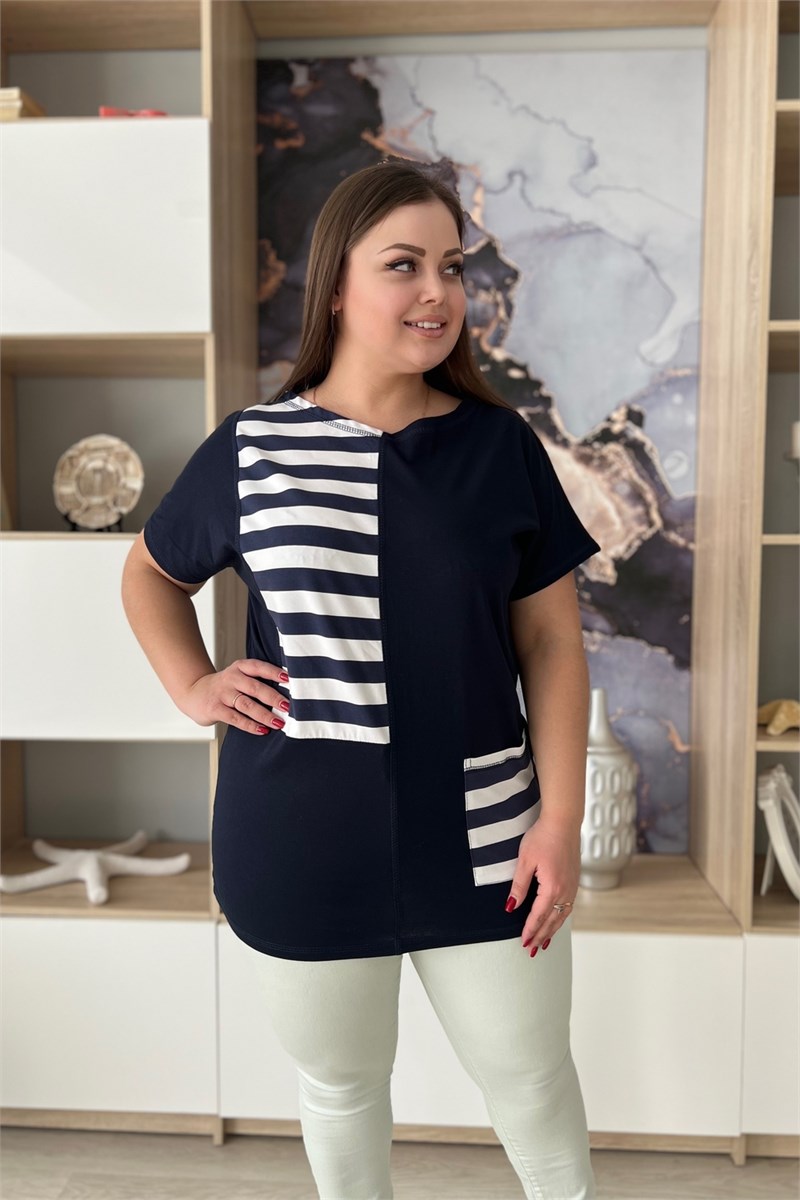Туника женская прямого силуэта с цельнокроенным коротким рукавом. На полочке вставка и накладной карман из ткани в полоску. На модели 52 размер
