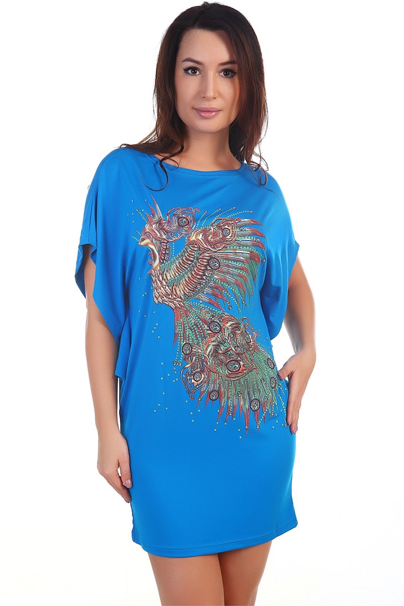Туника из вискозы с широкими рукавами. Принт в виде сказочной птицы с орнаментами, общая длина до середины бедра, рукав короткий. Пять расцветок бирюзовая, малиновая, ментоловая, фуксия и шоколадная