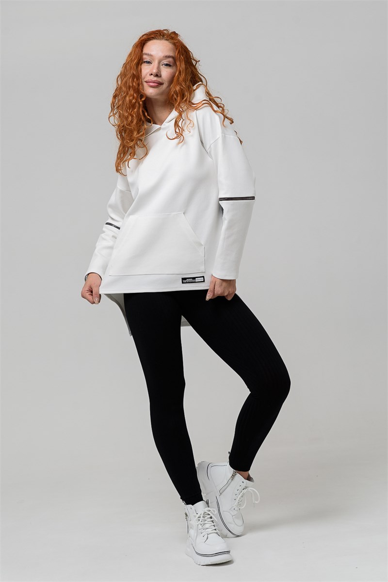 Женская туника выполнена из интерлока. Удлиненная спинка, капюшон. На рукавах в районе локтей выполнены разрезы, которые можно застегнуть на молнию. Имеется карман кенгуру и нашивка внизу толстовки.