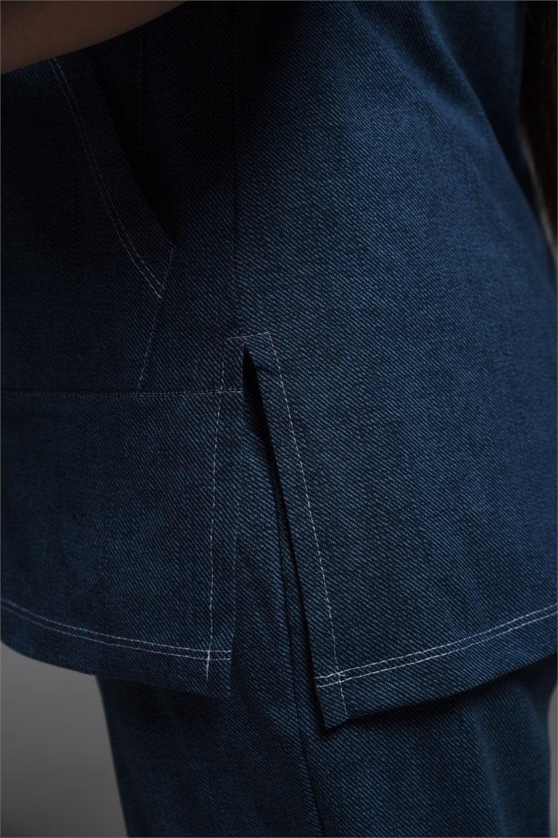 Туника прямого силуэта, с округлой горловиной, с удлиненной спинкой, длиной до середины бедра. На полочке расположены фигурные накладные карманы. Полочка и спинка с кокетками. Рукав короткий. В нижней части боковых швов обработаны разрезы. Горловина обработана бейкой из основного полотна.