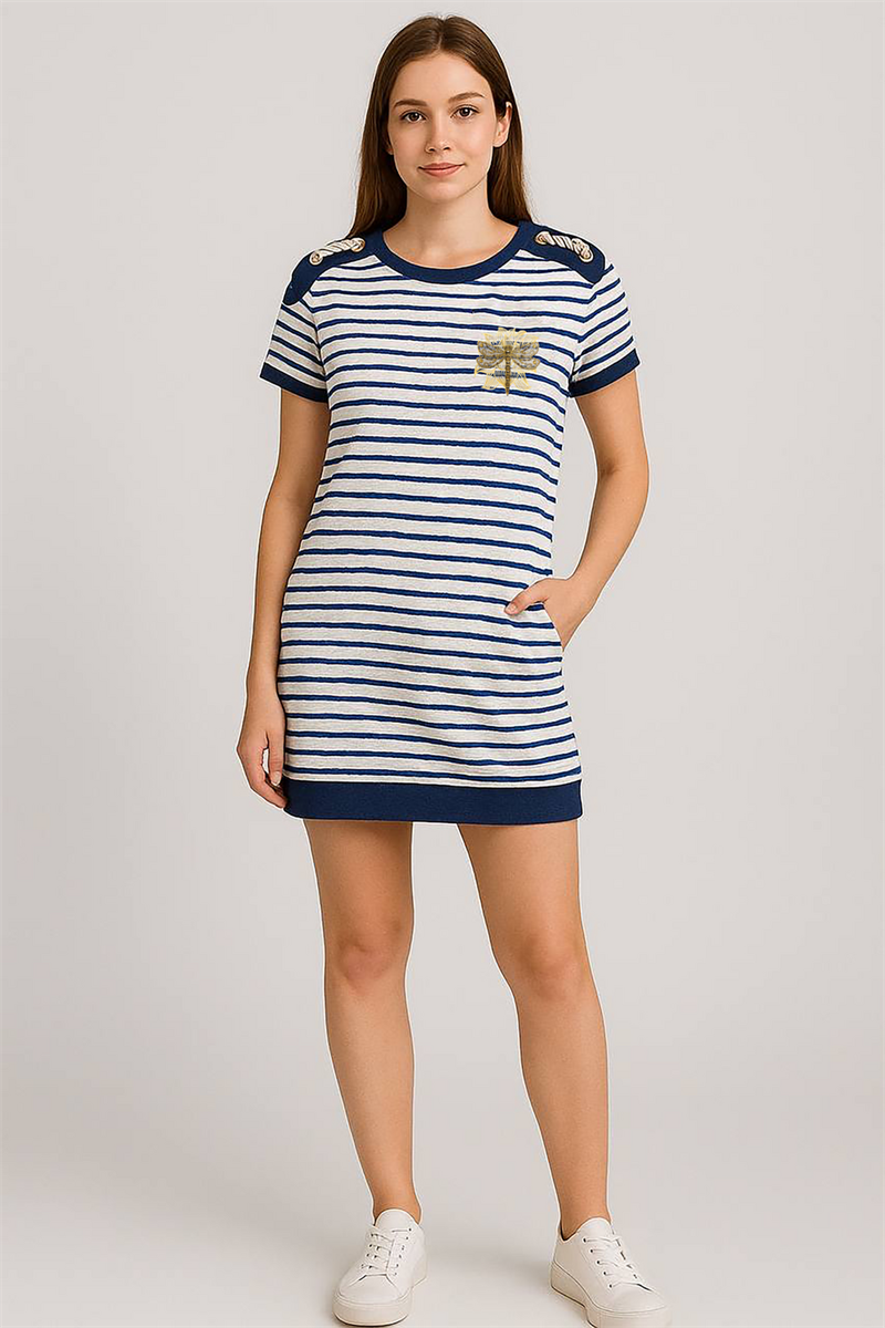 Туника женская с боковыми карманами из трикотажного полотна с выразительным сине-белым рисунком в полоску и дополнена яркой вышивкой в виде стрекозы. Модель выполнена из премиального кулирного полотна с лайкрой.