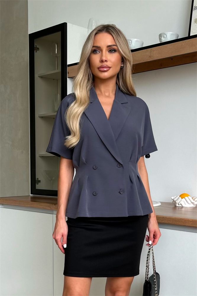Комфортный летний жакет приталенного силуэта выполнен из легкой костюмной ткани. Цельнокроенный короткий рукав. Английский отложной воротник. Двубортная застежка на петли и пуговицы. По линии талии застрочены складки. Низ ровный без рзрезов.
