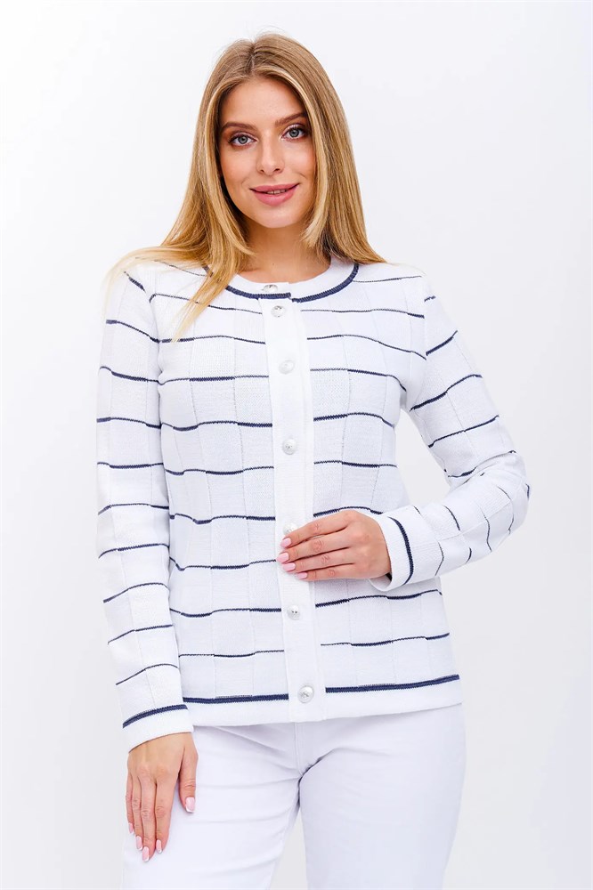 Нарядный женский жакет из трикотажного полотна полуприлегающего силуэта с круглой горловиной, на пуговицах. Рукава втачные длинные. Жакет выполнен переплетением, образующим шахматный рисунок. Контрастная эффектная отделка и металлические пуговицы.