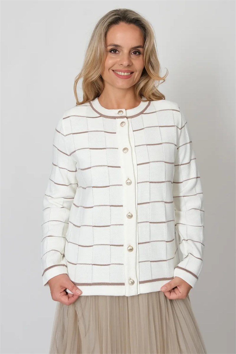 Нарядный женский жакет из трикотажного полотна полуприлегающего силуэта с круглой горловиной, на пуговицах. Рукава втачные длинные. Жакет выполнен переплетением, образующим шахматный рисунок. Контрастная эффектная отделка и металлические пуговиы.