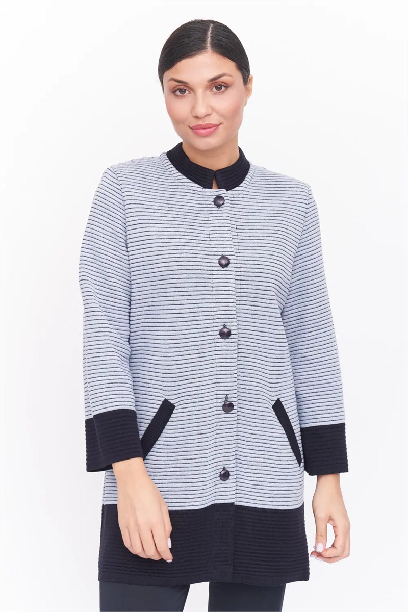 Жакет женский вязаный полуприлегающего силуэта с круглой горловиной и маленькой стойкой, удлиненный. Жакет на пуговицах по всей длине изделия. По бокам два прорезных кармана. Рукава втачные, длина 7/8. Жакет выполнен переплетением образующим валики с контрастным сочетанием отделки.