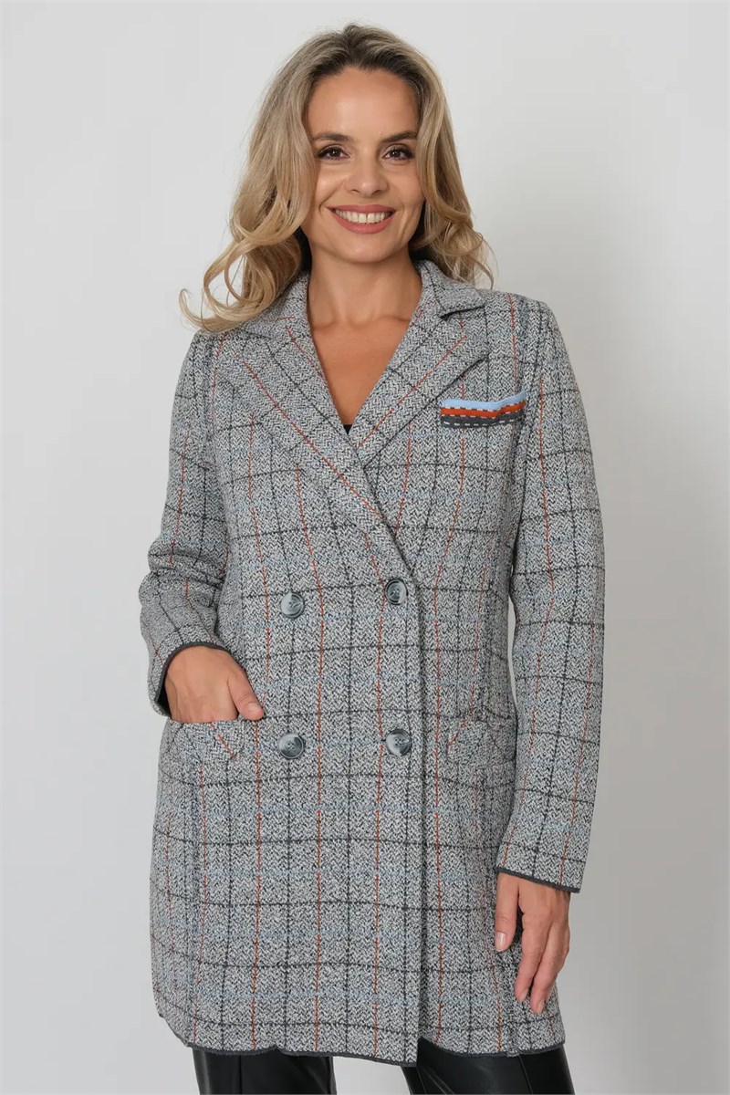 Двубортный женский жакет прямого удлиненного силуэта с V-образным вырезом, английским воротником из вязаного трикотажа. Рукав втачной длинный. Застёжка спереди на два ряда пуговиц. Два прорезных кармана с листочкой. Изделие выполнено жаккардовым переплетением образующим клетку.