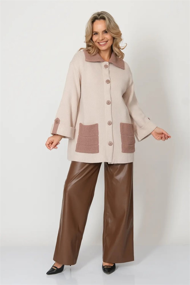 Элгантный вязаный женский жакет свободного силуэта с отложным воротником. Рукав втачной длинный, чуть расклешенный к низу, с патой, регулирующей длину. . По бокам два накладных кармана. Жакет застегивается на пуговицы.