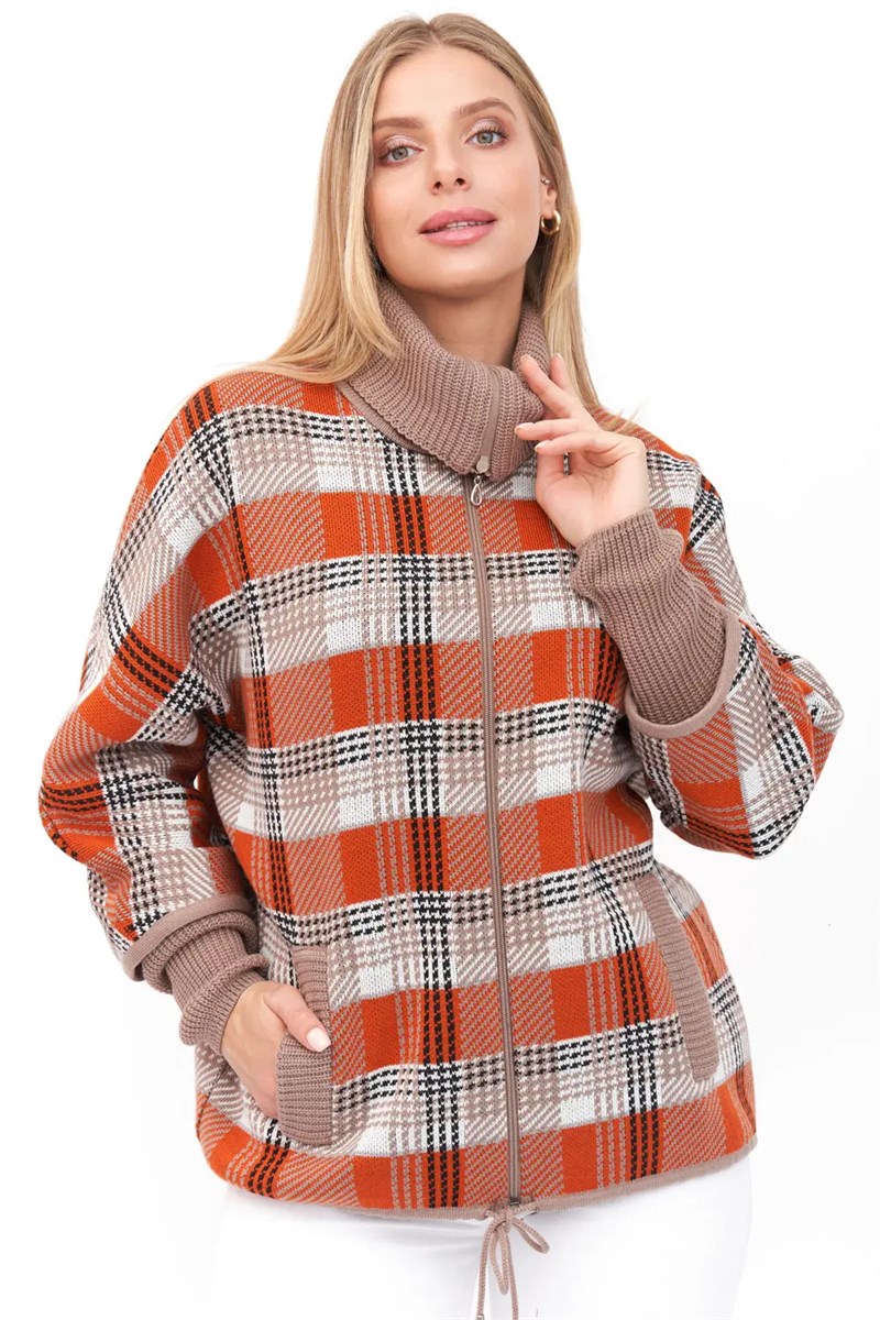 Жакет женский на молнии свободного силуэта с цельновывязанным рукавом 3/4 с удлиненными эластичными манжетами. Воротник-трансформер: стойка на молнии - отложной . По бокам вязанного жакета двапрорезных кармана с эластичной листочкой. По низу изделия проложен шнурок. Жаккардовый рисунок образует клетку.