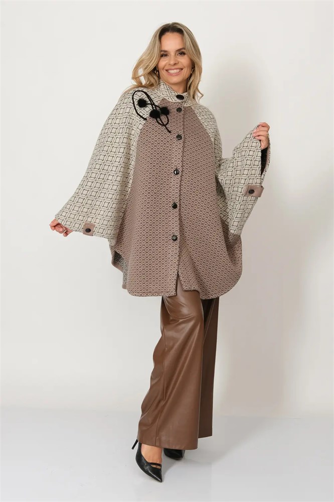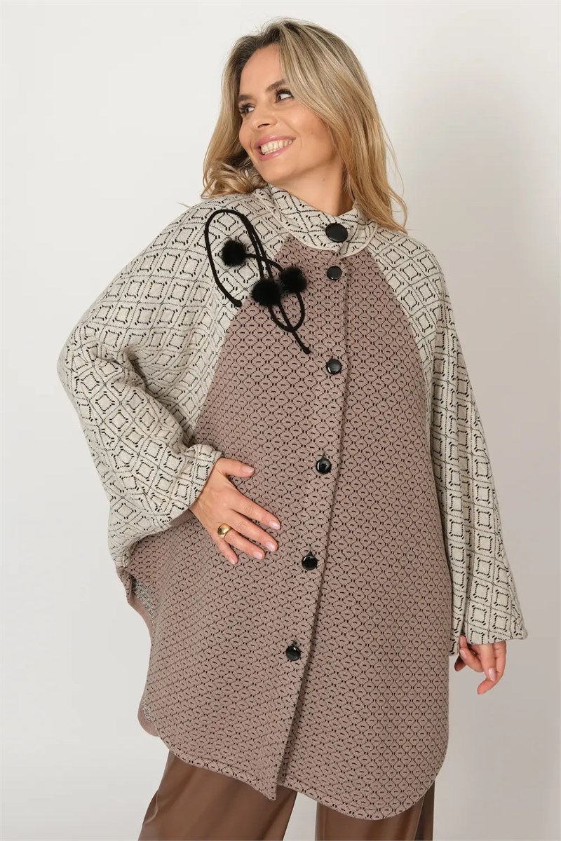 Женский вязаный жакет - пончо свободного силуэта на пуговицах. Теплое пончо выполнено из высококачественной пряжи с составом 30% шерсть 70% ПАН. Трикотажная накидка имеет воротник - стойку и цельнокроеные рукава с патами по краям. Длина изделия 75 см, длина рукава вместе с плечом 68 см. Нарядное пончо выполнено из очень интересного полотна с рельефным мелким узором. Полочка жакета декорирована аппликацией из шнура и меховых помпонов. Вязаная накидка свободного кроя в стиле оверсайз подойдет для женщин любого типа фигуры и поможет скрыть различные недостатки и подчеркнуть достоинства каждой дамы. Трикотажное пончо составит стильный, модный образ абсолютно с любыми вещами из Вашего гардероба. Комфортный вязаный жакет можно носить в качестве верхней одежды теплой весной или осенью и прохладным летом.
