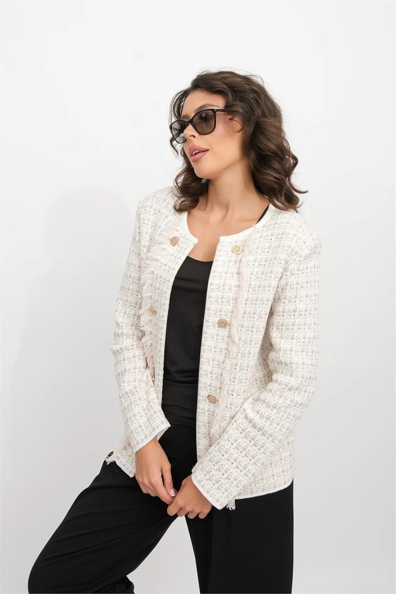 Жакет женский полуприлегающего силуэта с круглой горловиной. Жакет вязаный на молнии. Выполнен жаккардовым, структурным переплетением рисунок клетка.Прорезной карман с листочкой. Жакет выполнен в винтажном стиле, декорирован бахромой и акцентными пуговицами.