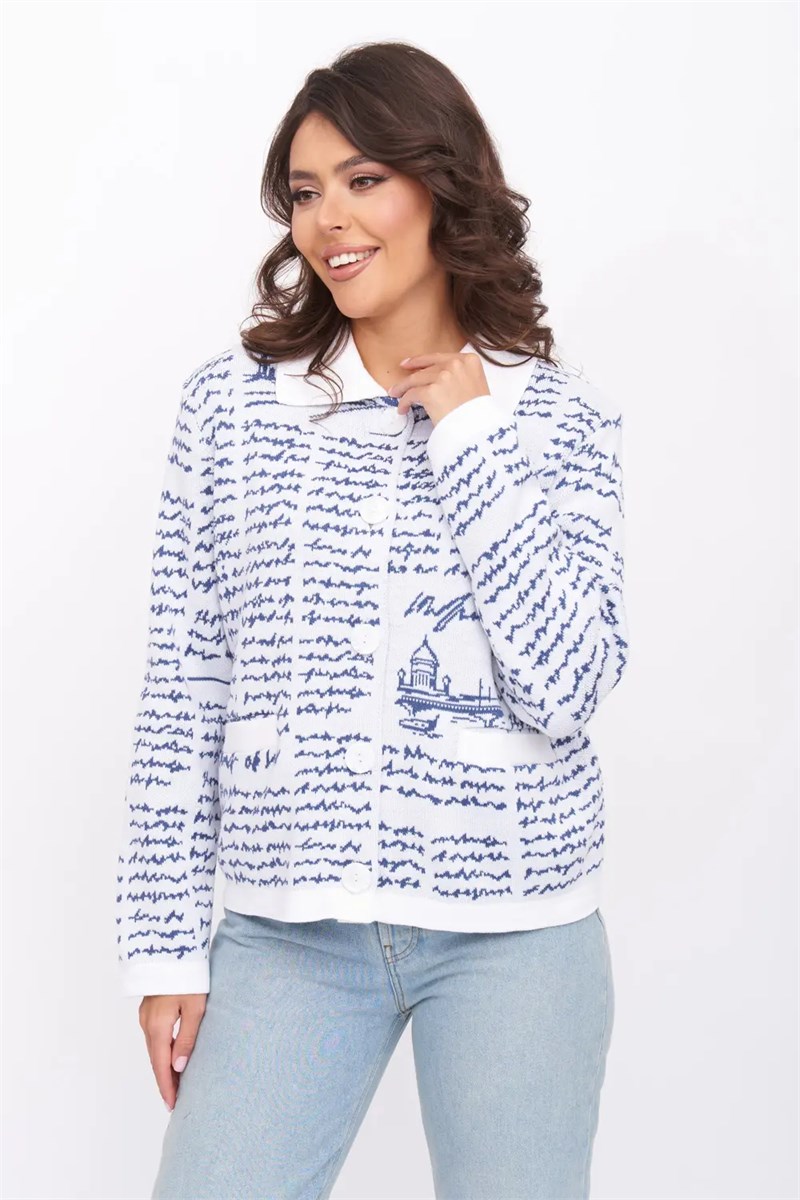 Вязаный женский жакет прямого силуэта с рубашечным отложным воротником. Рукав втачной длинный. По бокам два прорезных кармана с листочкой. Жакет застегивается на декоративные пуговицы. Изделие выполнено жаккардовым переплетением с оригинальным рисунком.