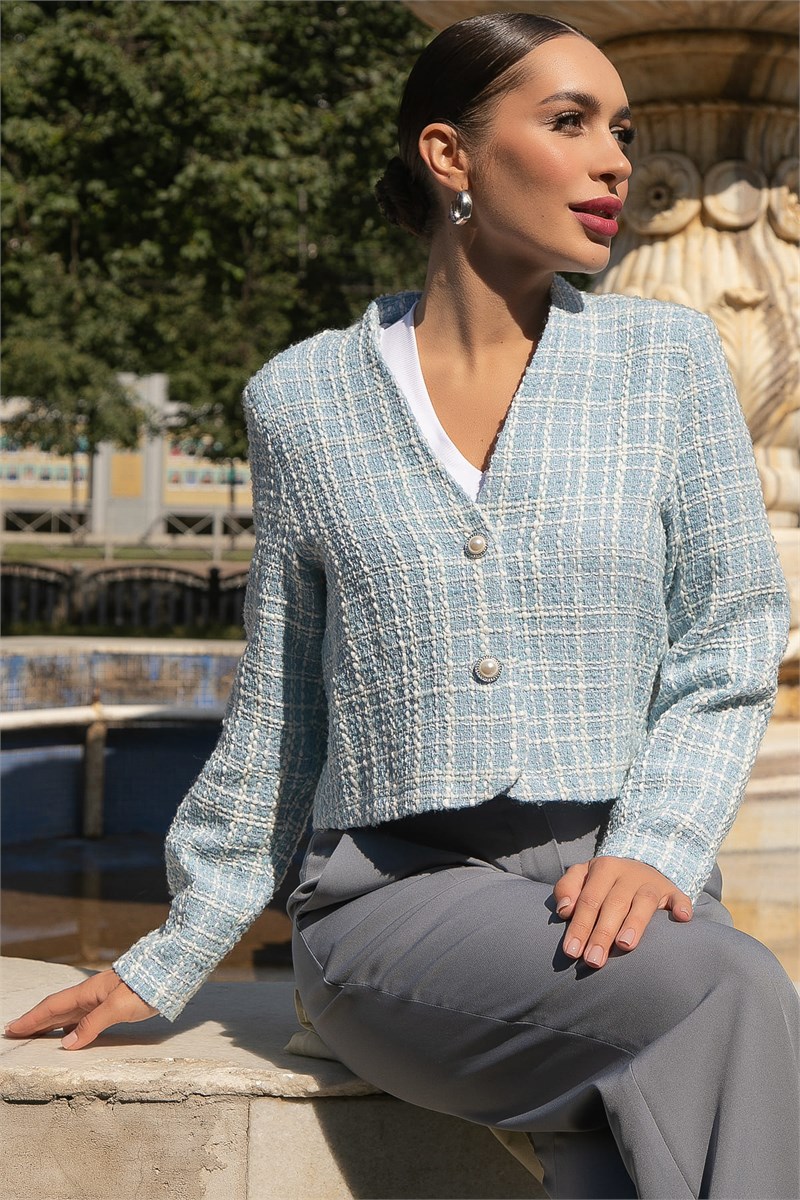 Состав : 40% хлопок, 30% вискоза, 30% полиэстер Материал : твид Цвет : голубой Принт : клетка Силуэт : прямой Карманы : отсутствуют Подкладка : отсутствует Вид застежки : пуговицы Декоративные элементы : отсутствуют Длина : 44-53 см, 46-54 см, 48-55 см, 50-56 см, 52-57 см, 54-58 см Отснято с брюками Б14103-34М [ https://ltcollection.ru/catalog/bryuki/196510/ ] и с джинсами Б13450-12М [ https://ltcollection.ru/catalog/bryuki/169715/ ] Женский укороченный твидовый жакет — это воплощение классики и стиля, перед которым невозможно устоять. Он идеально подходит как для деловых встреч, так и для повседневного образа. Легко сочетается с джинсами, юбкой-карандаш или брюками. Этот жакет подчеркнет вашу индивидуальность и добавит нотку изысканности. Он гармонично впишется в гардероб каждой женщины, которая хочет выглядеть стильно и уверенно. Внимание! Рекомендуем ориентироваться на размерную сетку и выбирать свой привычный размер, согласно размерной таблице. *Допуск отклонения длины при массовом производстве 1-3 см является нормой. Уход за изделием: Ручная стирка или стирка в машине при температуре до 30 °C, деликатный режим. Не использовать отбеливатели. Разрешена глажка при температуре до 110 °C. При глажке использовать специальную насадку на подошве утюга, гладить с паром. Не замачивать и не выжимать. Стирать изделие наизнанку, отдельно от других вещей.