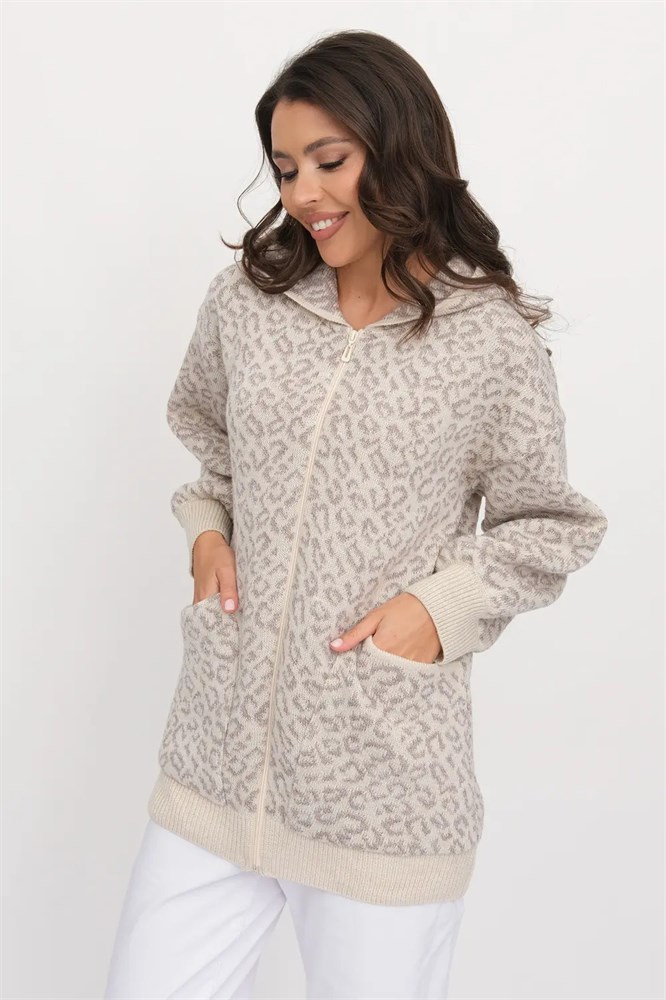 Жакет свободного силуэта на молнии с капюшоном. Два накладных кармана по бокам изделия. Рукава втачные длинные, плечо спущенное. Низ изделия и низ рукавов вывязан эластичным переплетением. Жакет выполнен жаккардовым переплетением, образующим анималистический рисунок.