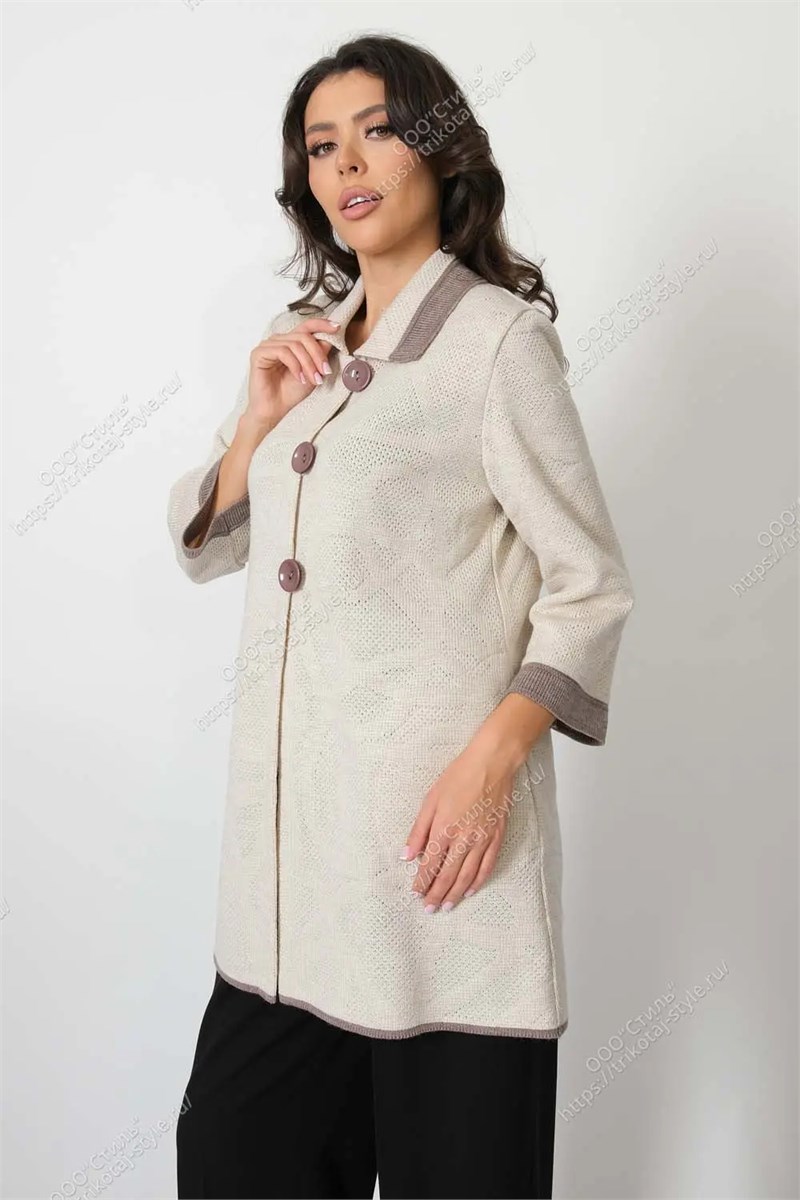 Жакет с отложным воротником, застегивающийся на три крупные пуговицы. Рукав втачной длиной 7/8. Карманы функциональные прорезные в боковых швах.