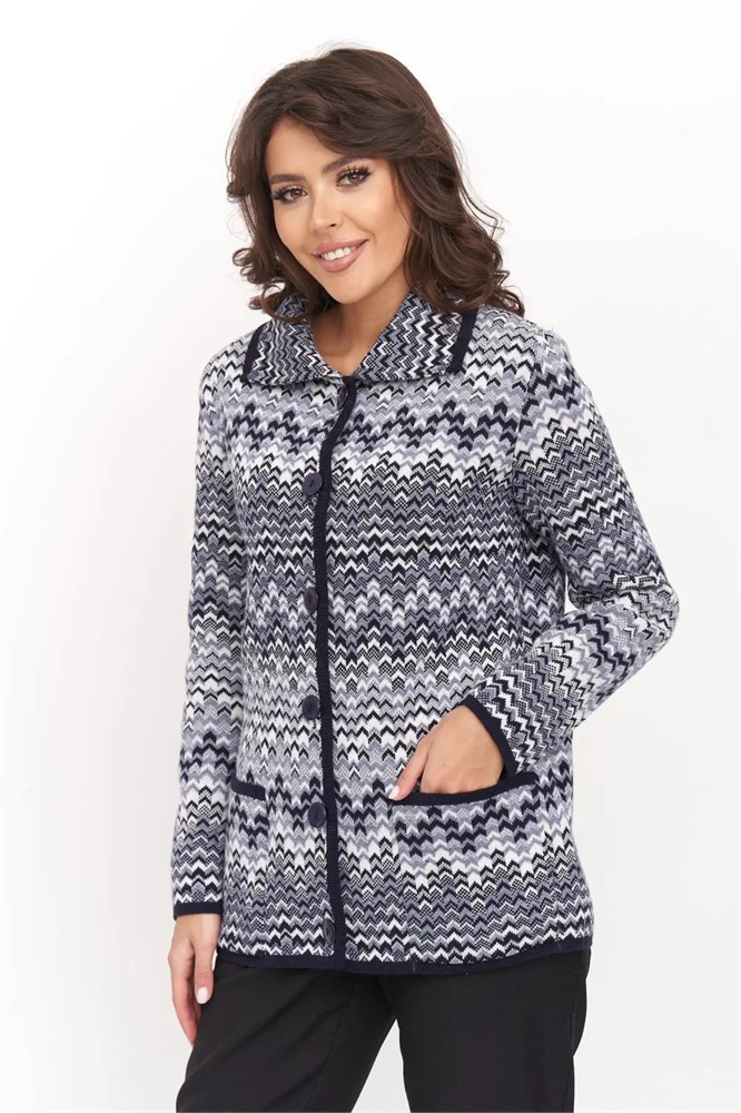 Вязаный женский жакет полуприлегающего силуэта с отложным воротником на пуговицах. Рукавые втачные длинные. Два накладных кармана. Жакет выполнен жаккардовым переплетением образующим горизонтальный орнамент.