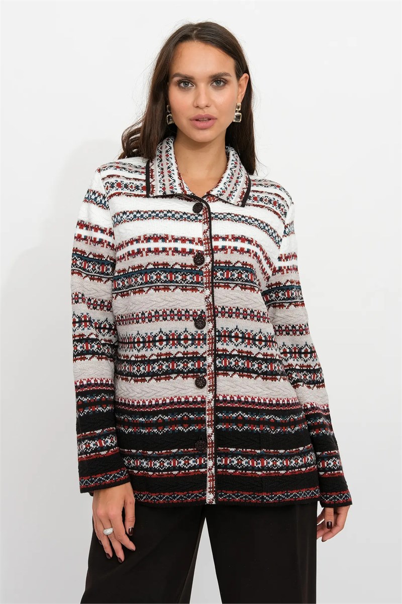 Женский жакет в офисном стиле, полуприталенного силуэта. Жакет вязанный на пуговицах. Отложной воротник, длинный рукав. Карманы прорезные горизонтальные. От низа изделия до верха изделия секционные горизонтальные полосы переходящие от темного к светлому. Воротник и бейка по переду изделия также выполнены жаккардовым рисунком.