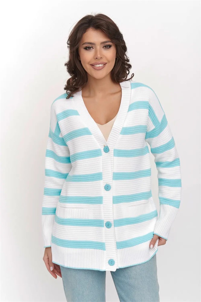 Жакет женский вязаный полуприлегающего силуэта на пуговицах в полоску. V-образный вырез. Спущенная линия плеча, рукав длинный. Манжет рукава, низ изделия и планка выполнены эластичная резинкой. Жакет выполнен из качественной пряжи с составом 30% хлопок 70% ПАН переплетением, образующим валики. Легкий, яркий, эффектный жакет поддержит и деловой образ, и праздничное настроение. Отлично сочетается с любым низом в комплекте. Модель классическая, праздничная и повседневная, абсолютно на любой случай жизни.