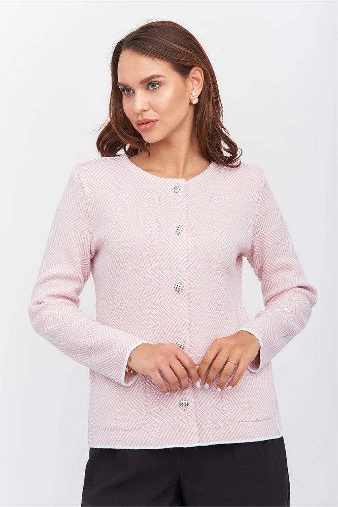 Женский вязаный жакет полуприлегающего силуэта на пуговицах. Вырез горловины круглый. Рукава втачные длинные. Два накладных кармана. Жакет выполнен жаккардовым переплетением, образуя неброский рисунок.