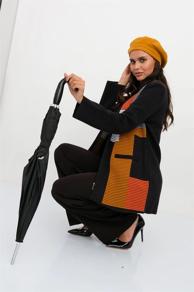 Удлиненный жакет полуприлегающего силуэта с круглой горловиной. По переду застежка-молния по всей длине изделия. По бокам два прорезных кармана. Рукава втачные длинные. Жакет выполнен переплетением образующим валики. Перед связан многоцветным геометрическим рисунком. Рукава и спинка однотонные. Горловина, низ рукавов, низ изделия и планка под молнию выполнены контрастным цветом.