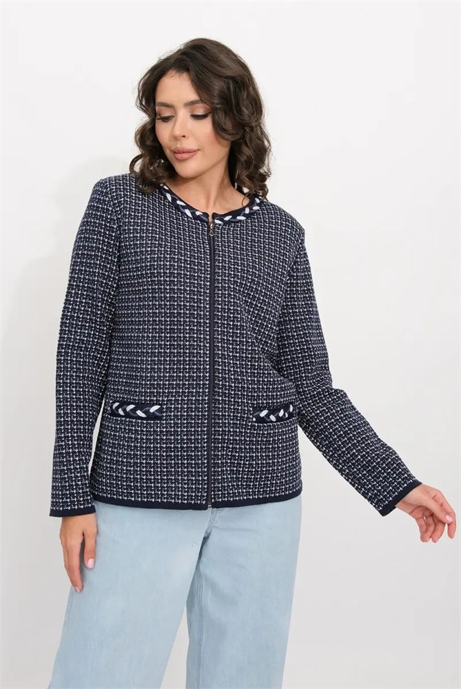 Жакет женский полуприлегающего силуэта с круглой горловиной. Жакет вязаный на молнии. Выполнен жаккардовым, структурным переплетением рисунок клетка. Горловина и линия входа в карман декорированы косами, которые выполнены из переплетающихся вязаных шнурков.