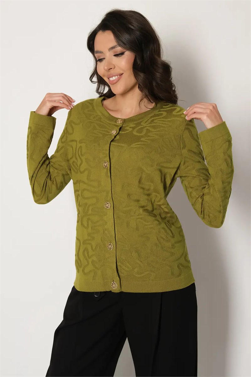 Нарядный женский жакет из трикотажного полотна полуприлегающего силуэта с круглой горловиной, на пуговицах. Рукава втачные длинные. Жакет выполнен структурным переплетением. Эффектная металлические пуговицы в отделке придают жакету нарядный вид..