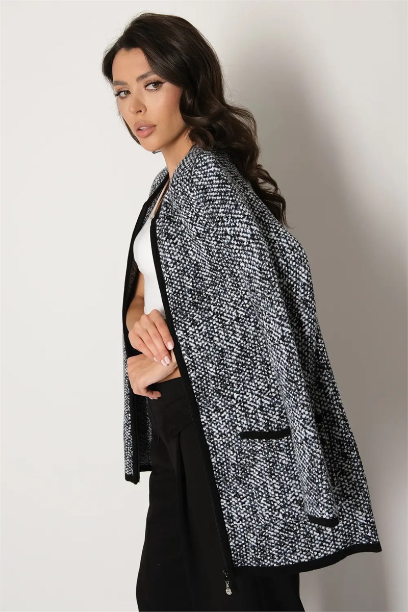 Женский вязаный жакет полуприлегающего силуэта с круглой горловиной без воротника. Модель удлиненная - длина составляет 75 см. Жакет застегивается на молнию по всей длине, края бортов обработаны контрастной бейкой. В модели выполнены функциональные карманы, края которых также обработаны бейкой. Жакет изготовлен из высококачественной пряжи с составом 30% шерсть, 70% ПАН. Рукава втачные, длинные. Жакет выполнен жаккардовым переплетением нитей 3х оттенков. Модель отлично дополнит Ваш деловой образ и подойдет для повседневной носки. В сочетании с классическими брюками или юбкой любой длины Вы будете выглядеть строго и официально. В сочетании с джинсами, в этом жакете можно пойти на вечеринку или на прогулку с друзьями.