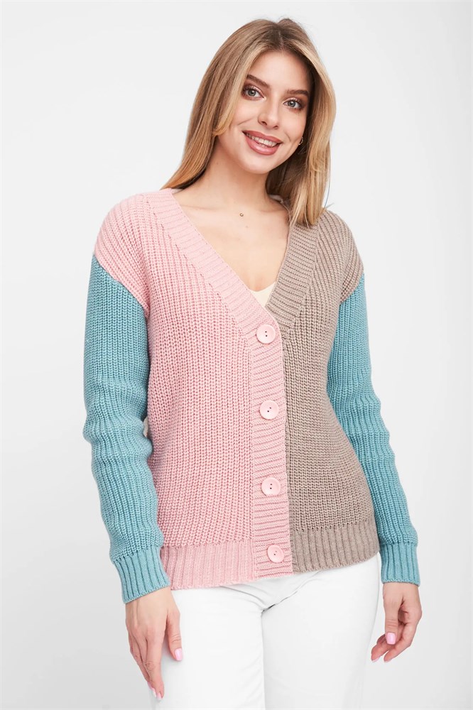 Вязаный жакет в стиле оверсайз с V-образным вырезом горловины, спущенным плечом и рукавом полной длины. Застёжка спереди на пуговицы. Полочки, спинка и рукава выполнены разного цвета пряжи.Эта модель - универсальный второй слой для создания утепленных повседневных образов.