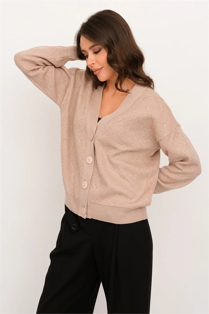 Удлиненный женский трикотажный жакет на пуговицах, V-образный вырез горловины. Плечо спущенное, рукава втачные длинные на эластичной манжете. Жакеты выполнен накладным жаккардовым переплетением образующим рельефный рисунок Планка выполнена формоустойчивым переплетением.