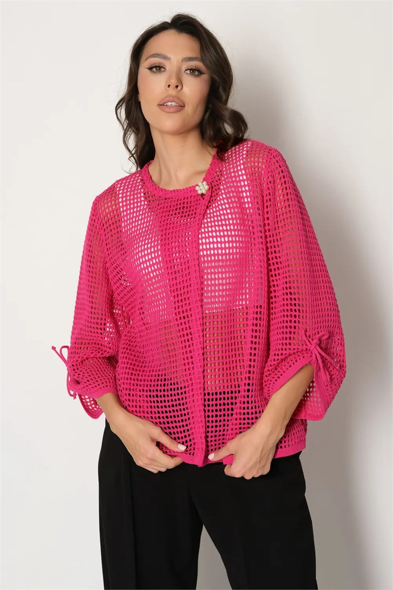 Жакет выполнен ажурной сеткой из смесовой пряжи с натуральным хлопком. Горловина круглая, рукава втачные длиной 7/8. Жакет застёгивается на одну пуговицу на горловине, вторая пуговица потайная расположена симметрично на передней планке изделия. Жакет можно носить в тёплое время года вторым слоем на топы, блузы, майки.