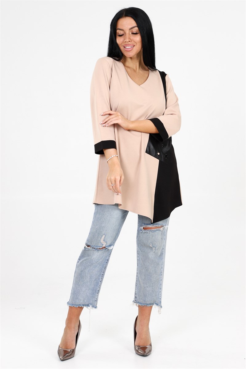Эта элегантная туника с асимметричным кроем - идеальное решение для модных и уверенных в себе женщин. Комбинация двух цветов добавляет оригинальности и создаёт эффектный визуальный акцент, что делает эту тунику незаменимой в вашем гардеробе. Она отлично подходит для любого случая: будь то прогулка по городу, вечер с друзьями или даже деловая встреча. Ассиметричный крой не только привносит в образ стиль, но и визуально корректирует фигуру, выгодно подчёркивая её достоинства. Легкий и приятный на ощупь материал обеспечивает комфорт на целый день. Он отлично пропускает воздух, не сковывает движения и легко поддается уходу. Рукав 3/4 на манжете добавляет изысканности и позволяет носить тунику в разнообразных погодных условиях. Особое внимание здесь уделено деталям. Накладной карман с отделкой из люверсов не только функционален, но и служит стильным декоративным элементом. Этот акцент делает тунику уникальной и выделяет вас среди других. Ключевые слова: стильная туника, туника с асимметричным кроем, двухцветная туника, туника для любого случая, женская туника с карманом, декоративные люверсы, туника с рукавами 3/4, модная туника, комфортная женская одежда, гардероб современной женщины. Подарите себе возможность выглядеть стильно и уверенно в любой ситуации. Эта туника станет вашим верным спутником в любых приключениях!