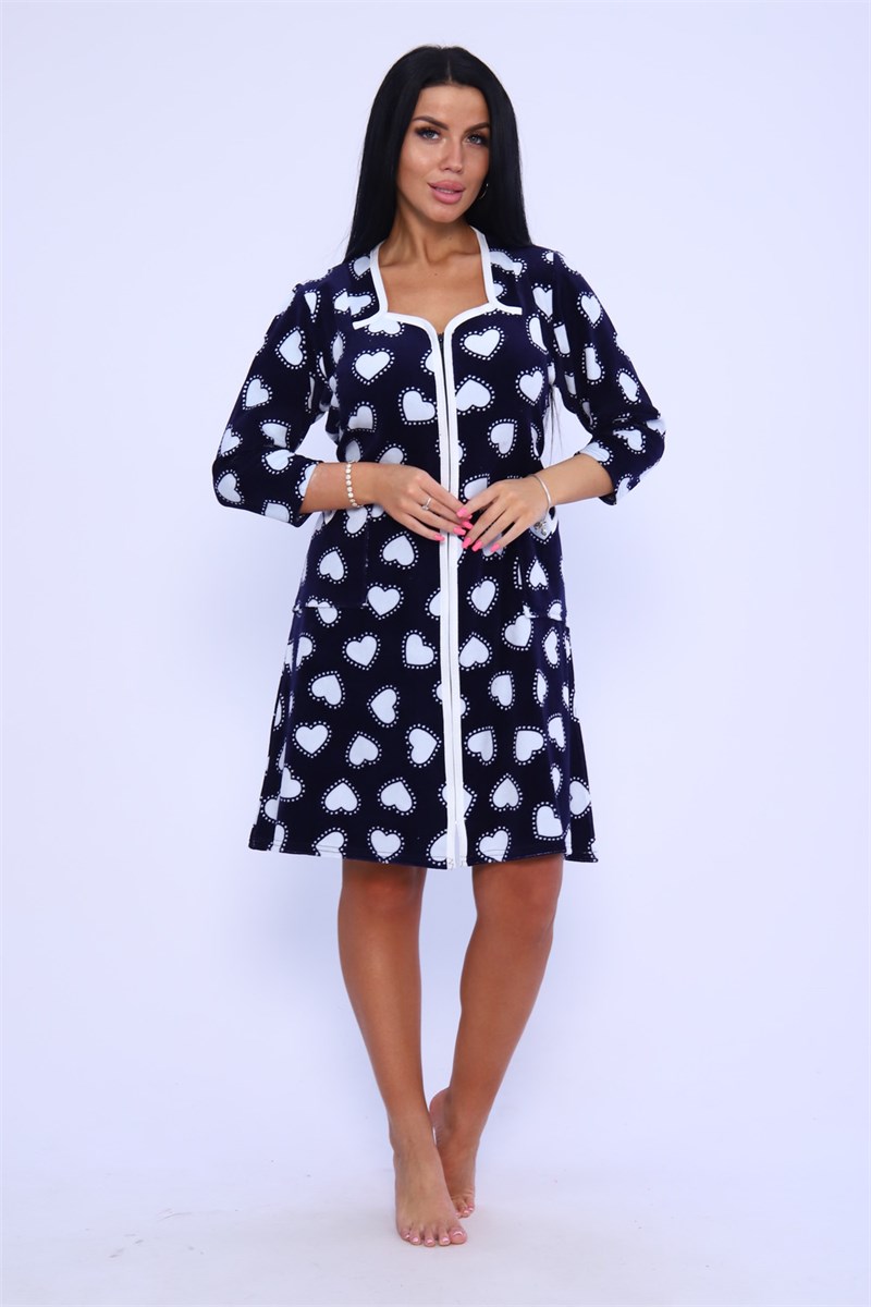 Уютный домашний женский халат на молнии. Выполнен из велюра, с двумя карманами, рукава чуть ниже локтей, общая длина приблизительно до коленей. Очень теплый и приятный к телу.