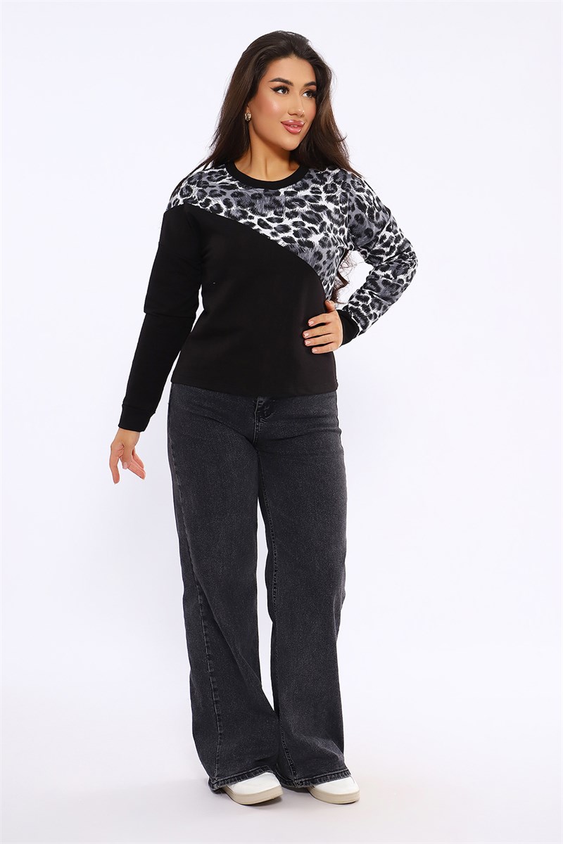 Основной акцент в дизайне сделан на асимметричную комбинацию цветов: базовый серый/черный плавно переплетаются с эффектным леопардовым принтом, создавая динамичный и современной образ. Такой свитшот отлично подойдет для смелых и уверенных в себе, кто любит выделяться из толпы.
