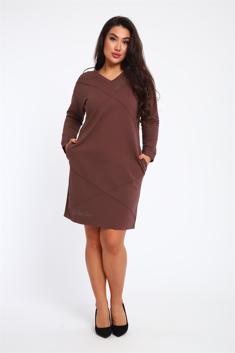 Прямой силуэт платья обеспечивает свободу движений и особый комфорт в носке, подходя для любого типа фигуры. Длинный рукав с аккуратной манжетой добавляет изысканности и утонченности вашему образу, делая его более завершенным и гармоничным. V-образный вырез визуально удлиняет шею и акцентирует внимание на вашей женственности, придавая всему образу нотки элегантности и роскоши.