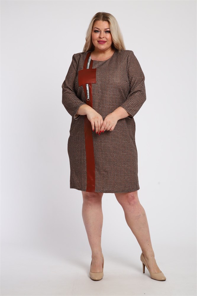 Женское платье прямого силуэта из ткани Сандра с вставкой из стрейч-кожи. Идеальный выбор для стильных женщин: от 54 до 60 размера.