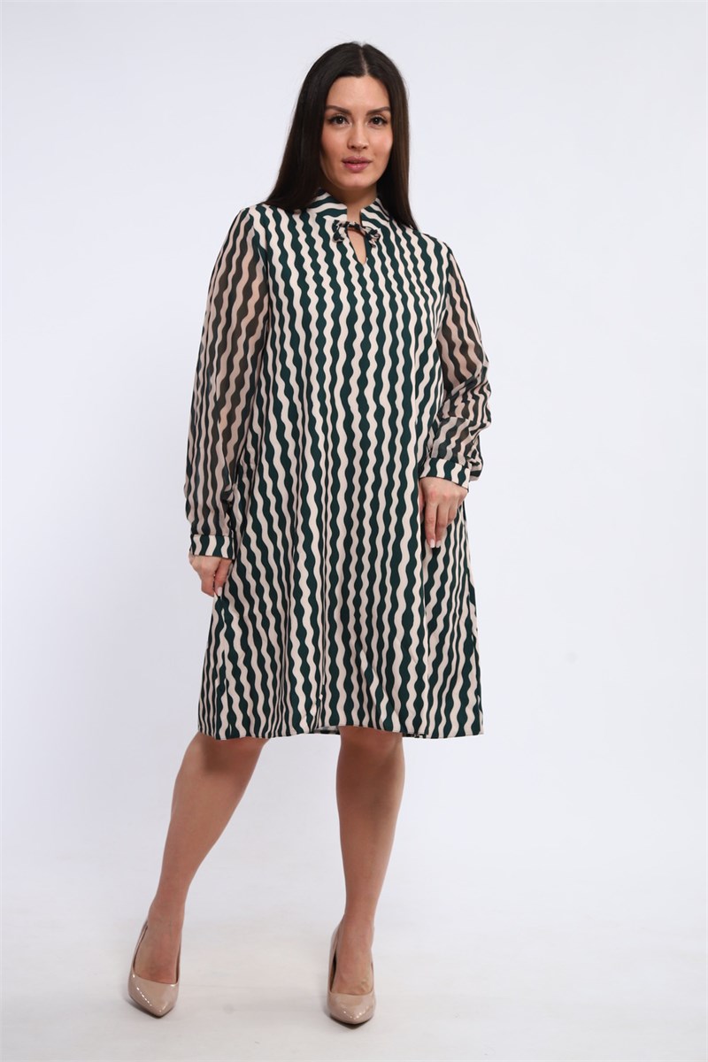 Изысканное женское платье трапециевидного силуэта воплощение утонченности и комфорта. Воротник-стойка, украшенный кокетливыми завязками, придает образу нотку романтики и загадочности. Легкая ткань мягко струится по фигуре, обеспечивая свободу движений и ощущение невесомости.