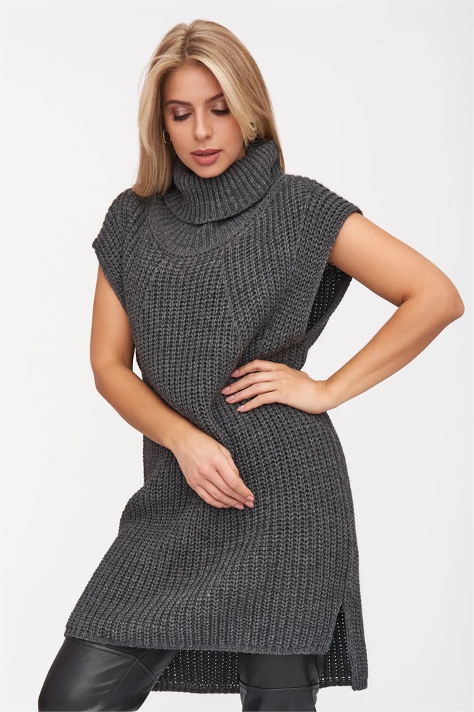 Оригинальный женский жилет прямого кроя с воротником стойка. Плечо спущенное. Удлиненная спинка, разрезы по бокам.Можно надевать в офис и школу поверх блуз, водолазок. Прекрасная вещь для второго слоя при создании утепленных осенних образов.