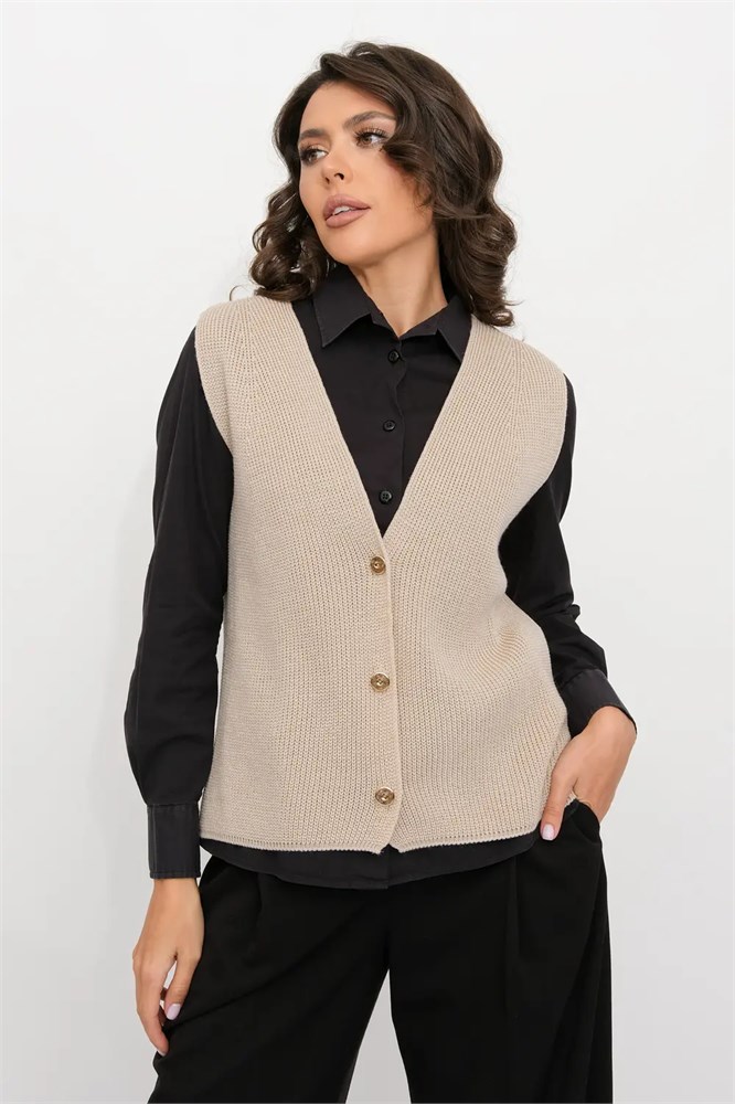 Классический женский жилет на трех пуговицах. Связан гладким переплетением. Отлично смотрится как с классической рубашкой, блузкой, водолазкой, так и с молодежным лонгсливом или футболкой.